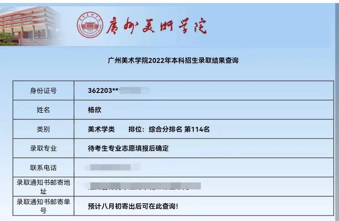 很开心逐梦的路上能遇到如此多的良师益友,也很庆幸自己的努力终不负选择!今年联考,我考了省422名,高考文化是360分,最终顺利录取到了广州美术学院!查到录取结果的那刻心情很激动,周围的老师朋友也给了我很多的祝福。